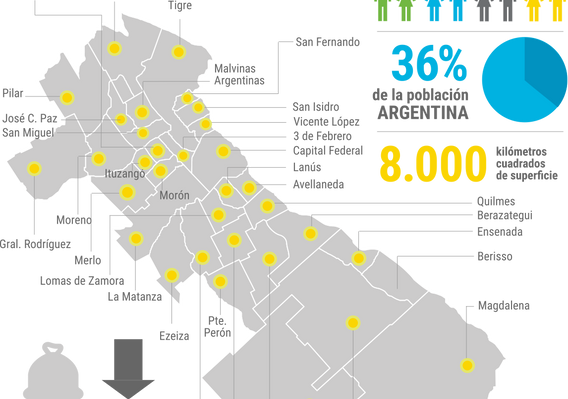 (11) El ámbito geográfico de acción se encuentra conformado por: la Ciudad Autónoma de Buenos Aires y los partidos bonaerenses de Almirante Brown, Avellaneda, Berazategui, Berisso, Brandsen, Ensenada, Escobar, Esteban Echeverría, Ezeiza, Florencio Varela, General Rodríguez, General San Martín, Hurlingham, Ituzaingó, José C. Paz, La Matanza, La Plata, Lanús, Lomas de Zamora, Magdalena, Malvinas Argentinas, Merlo, Moreno, Morón, Pilar, Presidente Perón, Quilmes, San Fernando, San Isidro, San Miguel, Tigre, Tres de Febrero y Vicente López. Sitio web de la CEAMSE (www.ceamse.gov.ar)